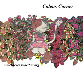 Coleus Corner is the founder's area, basically. I chose the coleus because of a fond memory I have of shopping for my mom for Mother's Day. I found a plant called the Sun Coleus and immediately fell in love: pink, green, and black all in the same plant. It was so vibrant I fell in love instantly. It flourished under a bush in the frontyard of my childhood home until we moved away a couple years later. I wonder if its still there or if the new owners dug it up. It'd be a crying shame if they did though :(